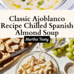 Ajoblanco is a refreshing Spanish white gazpacho made with almonds, stale bread, garlic, olive oil, and sherry vinegar, served chilled and garnished with green grapes. This cold soup is perfect for warm weather and showcases the creamy texture and nutty flavors characteristic of Andalusian cuisine.