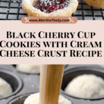 These Black Cherry Cup Cookies are a delightful twist on the classic cherry pie cookie, featuring a rich cream cheese crust and a homemade black cherry filling with a hint of cinnamon. Perfectly portioned in a mini muffin tin, these cookies offer a sweet and tangy burst of cherry flavor encased in a tender, buttery crust, dusted with powdered sugar for a beautiful finish.