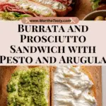 This Burrata, Prosciutto, and Coppa Sandwich combines creamy burrata cheese with the salty richness of prosciutto and coppa, enhanced by homemade pesto, briny Castelvetrano olives, and fresh arugula, all nestled inside a crusty ciabatta loaf. Perfect for a flavorful and elegant sandwich, ready in just 30 minutes and serves six.