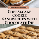 Delicious Cheesecake Cookie Sandwiches featuring classic chocolate chip cookies filled with a creamy cheesecake mixture and dipped halfway in smooth, melted chocolate. Perfect for an easy no-bake treat that’s loved by both kids and adults.