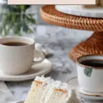 A slice of three-layer white cake with light cream filling between each layer sits centered on a white plate with green and dark green spots. The top of the cake slice is covered with shredded coconut. In the background, another slice on a similar plate and the full cake covered in white frosting and shredded coconut sits on a woven wooden cake stand. To the right, there is a white cup and saucer with dark coffee. The scene is on a white marbled surface with a small bouquet of pink and white flowers in a clear vase behind. Photo taken with an iphone --ar 4:5 --v 7