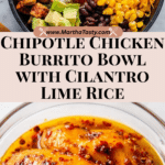 This Chicken Burrito Bowl recipe is a flavorful copycat of Chipotle’s famous chicken bowl. Marinated in a zesty blend of chipotle peppers, lime, and spices, the grilled chicken is served over cilantro lime rice and topped with fresh ingredients like corn, black beans, romaine lettuce, avocado, cheese, salsa, and sour cream to create a satisfying and vibrant meal.
