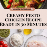 This Creamy Pesto Chicken recipe features tender, golden-brown chicken breasts cooked in a rich and flavorful pesto cream sauce with cherry tomatoes and fresh basil. Ready in just 30 minutes, it’s an easy and elegant skillet meal perfect for weeknights or special occasions.