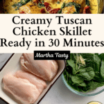 This Tuscan Chicken recipe features tender chicken thighs simmered in a rich, creamy sauce with sun-dried tomatoes, fragrant Italian herbs, garlic, spinach, and parmesan cheese. Cooked in a cast iron skillet, this dish delivers a perfect balance of savory flavors and creamy textures, making it an ideal comforting weeknight meal ready in just 30 minutes.