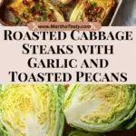 Delicious and easy roasted cabbage steaks with garlic, olive oil, and toasted pecans, topped with Parmesan and fresh herbs for a flavorful and healthy side dish.