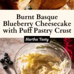 This Custardy Burnt Basque Blueberry Cheesecake features a flaky puff pastry crust filled with a smooth, creamy cheesecake batter swirled with blueberry jam and fresh blueberries. Baked at high heat to develop a deeply golden, slightly burnt top while maintaining a luscious, jiggly center, this cheesecake offers a perfect balance of rich custard flavor with a hint of fresh fruitiness and an irresistible flaky crust.