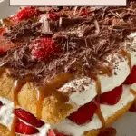 This Giant Chocolate Eclair recipe features a large, golden choux pastry filled with luscious custard cream and fresh berries, topped with smooth caramel chocolate ganache and a chocolate flake garnish. Baked to perfection with a crispy exterior and soft, airy interior, it’s a show-stopping dessert ideal for special occasions and sharing.