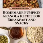 This homemade pumpkin granola is a deliciously spiced and crunchy snack or breakfast topping, featuring rolled oats, pecans, pepitas, and pumpkin puree, all baked to golden perfection with warm pumpkin pie spices and natural sweeteners.