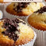 The image shows several muffins with a golden-brown, slightly cracked top texture, each wrapped in white parchment paper liners. The muffins have a soft, crumbly surface with visible dark chocolate streaks running through them, giving a marbled effect. They are arranged close together on a white marbled surface, with no additional items visible. Photo taken with an iphone --ar 4:5 --v 7