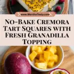 No-Bake Cremora Tart Squares with Granadilla are a creamy, refreshing South African dessert made with a buttery biscuit crust, a smooth yoghurt and Cremora filling, and topped with fresh granadilla pulp. Quick to prepare with no baking required, this tart sets perfectly in the fridge for a sweet, tangy treat that’s perfect for any occasion.