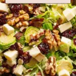 A vibrant and flavorful Shaved Brussels Sprouts Salad combining crispy bacon, tangy vinaigrette, sweet dried cranberries, sharp white cheddar, and crunchy walnuts for a refreshing and wholesome dish perfect as a side or light meal.