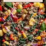 This Sheet Pan Gnocchi with Kielbasa and Vegetables is a quick, flavorful one-pan meal featuring crispy cauliflower gnocchi, smoky kielbasa, vibrant bell peppers, sweet cherry tomatoes, and tender baby spinach. Perfect for a wholesome weeknight dinner, it’s roasted to perfection with fresh herbs and finished with a sprinkle of Parmesan cheese.