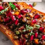 This Stuffed Honeynut Squash recipe features tender roasted honeynut squash filled with a wholesome mixture of wild rice, quinoa, lentils, sautéed mushrooms, and aromatic herbs. Topped with fresh pomegranate seeds and candied pecans, it offers a delightful balance of savory flavors and textures perfect for a hearty, nutritious vegetarian meal.